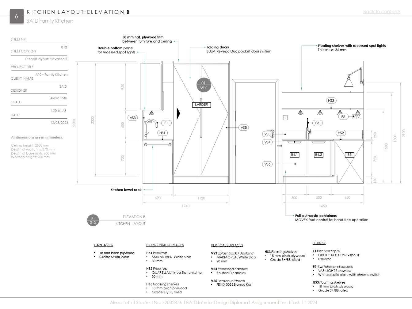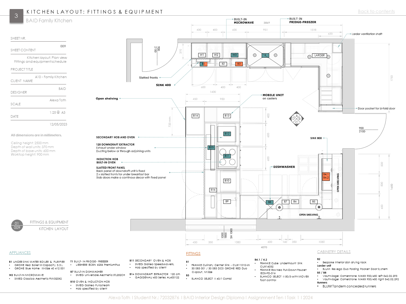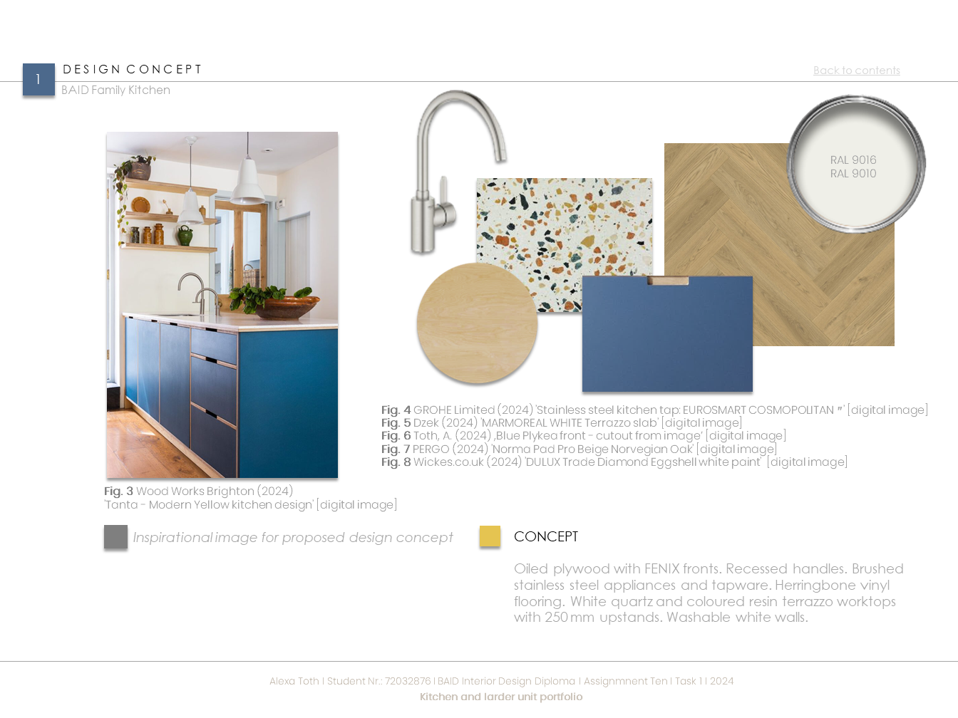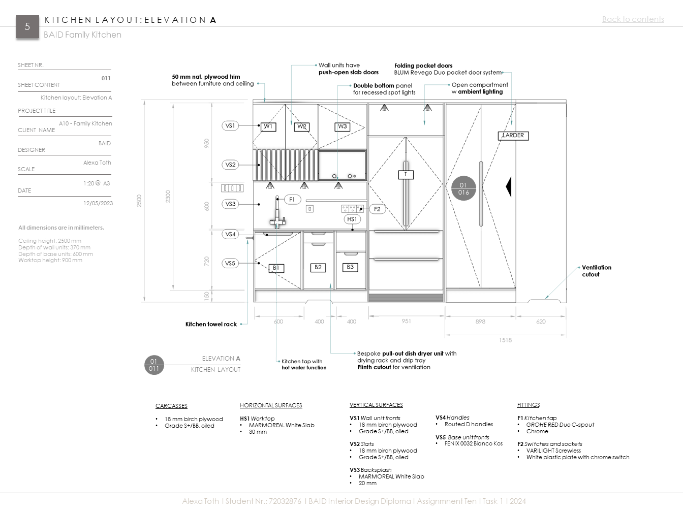 Extenzív kutatómunka inspirálta konyha egy aktív, kétgyerekes család igényeihez igazítva. Az 50-60-as évek modern stílusát és anyaghasználatát (pl. rétegelt lemez), valamint mai, innovatív megoldásokat és anyagokat ötvöz (pl. zsebes harmonikaajtó. ujjlenyomatmentes FENIX és kompozit anyagok). A többfunkciós kamraszekrény a feladat egyik fő pillére volt.